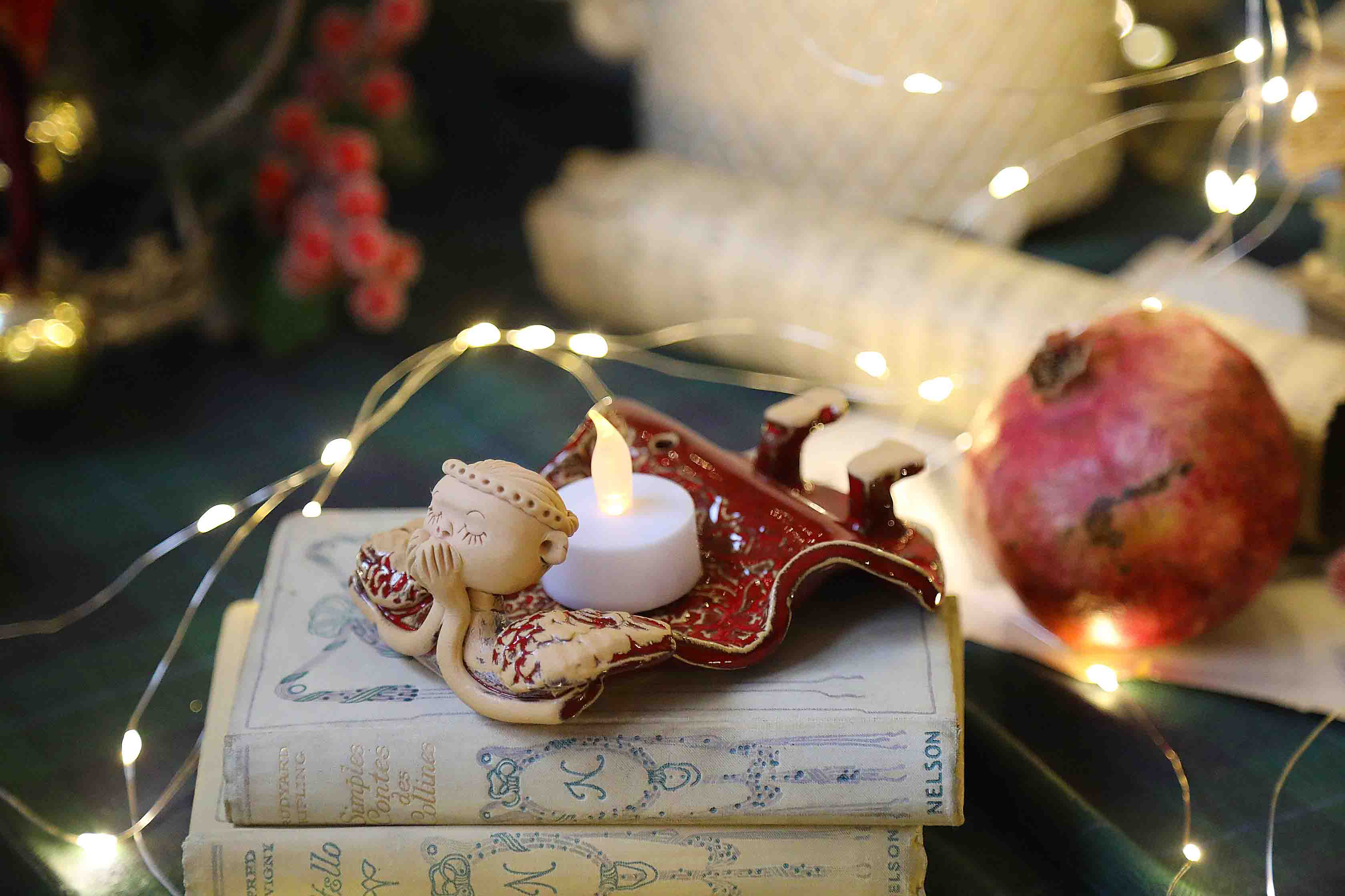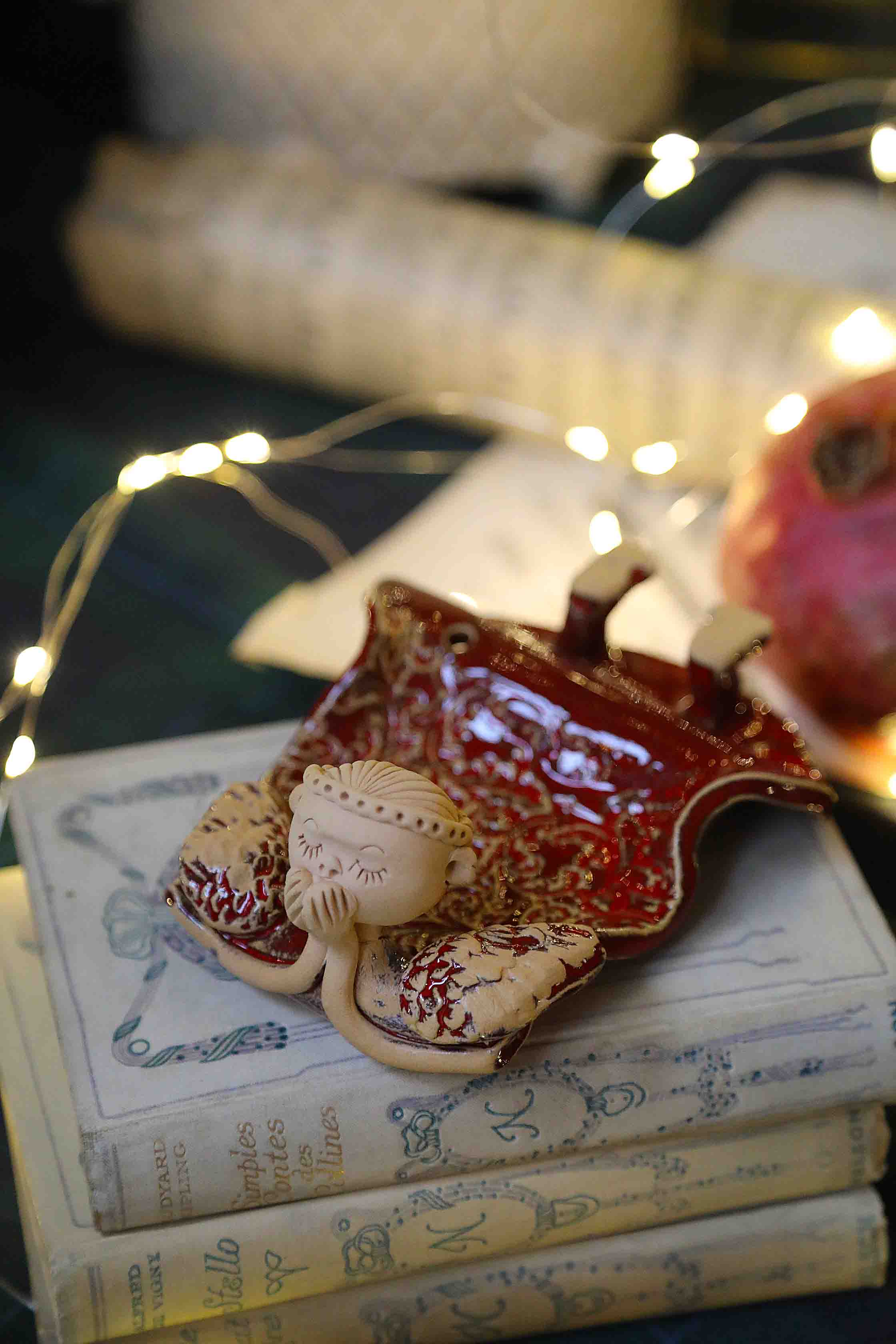 Jūsų namų angelas sargas, nešantis palaiminimus ir šilčiausius linkėjimus. Gulintis angelas gali būti naudojamas kaip padėkliukas, žvakidė ar smilkalinė. Raudonas molis, glazūra.
