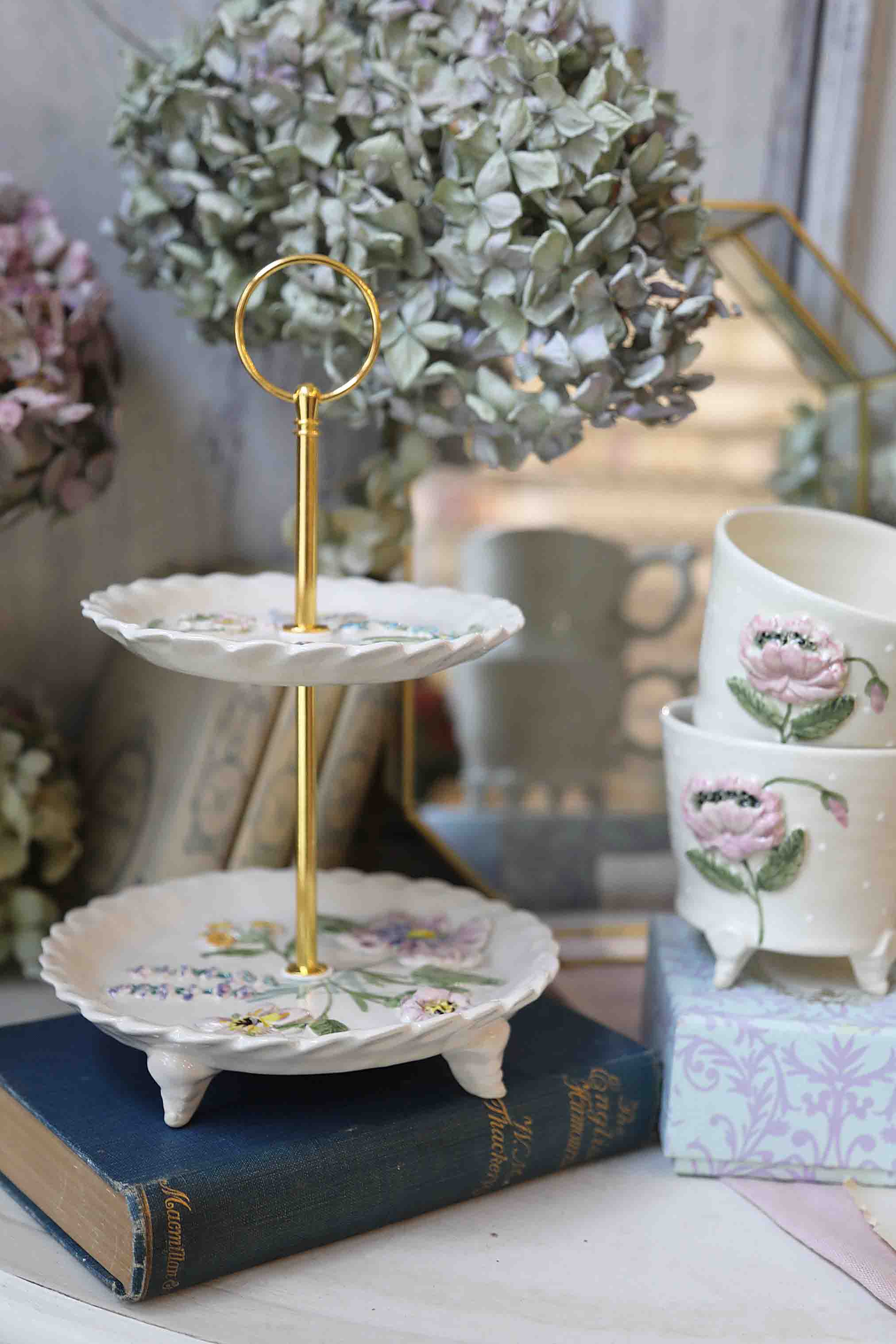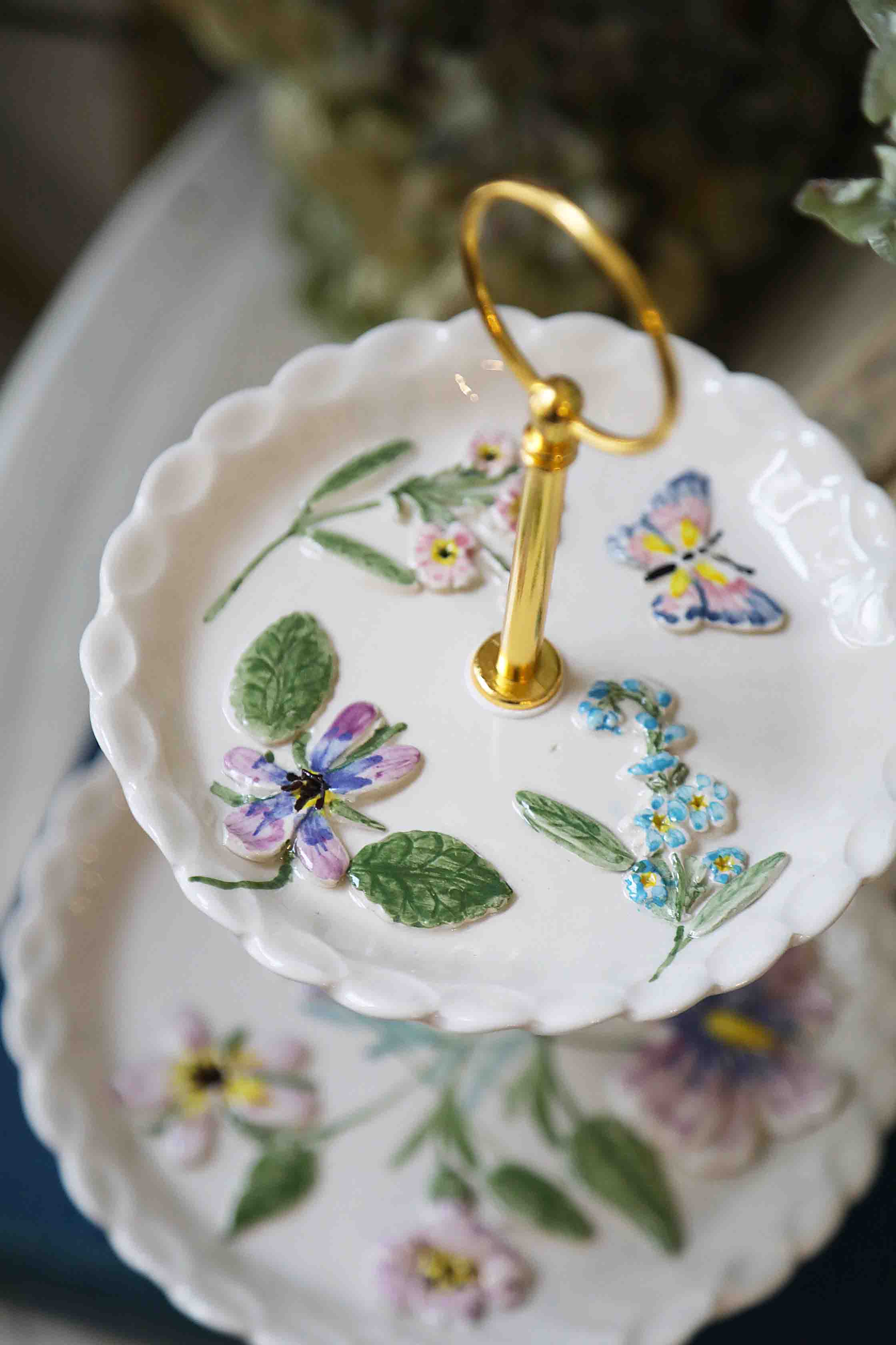 Dviejų aukštų nedidelė desertinė, serviravimo lėkštė. Metalinė aukso spalvos rankenėlė. Rombelių dekoras dekoras su porceliano taškeliais. Rankų darbo balto molio keramika. Desertams, šokoladams, vaisiams ar kitiems skanėstams.