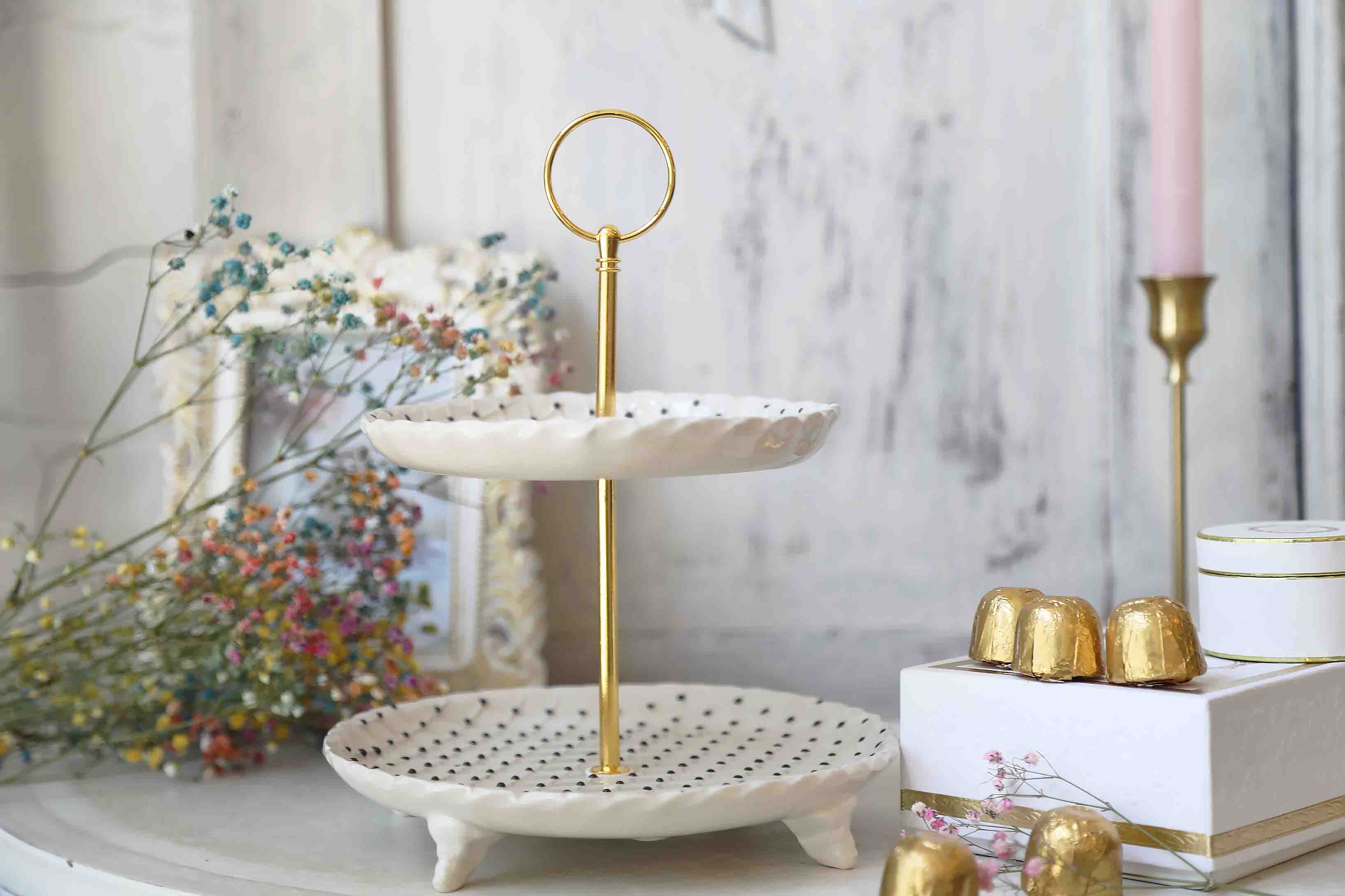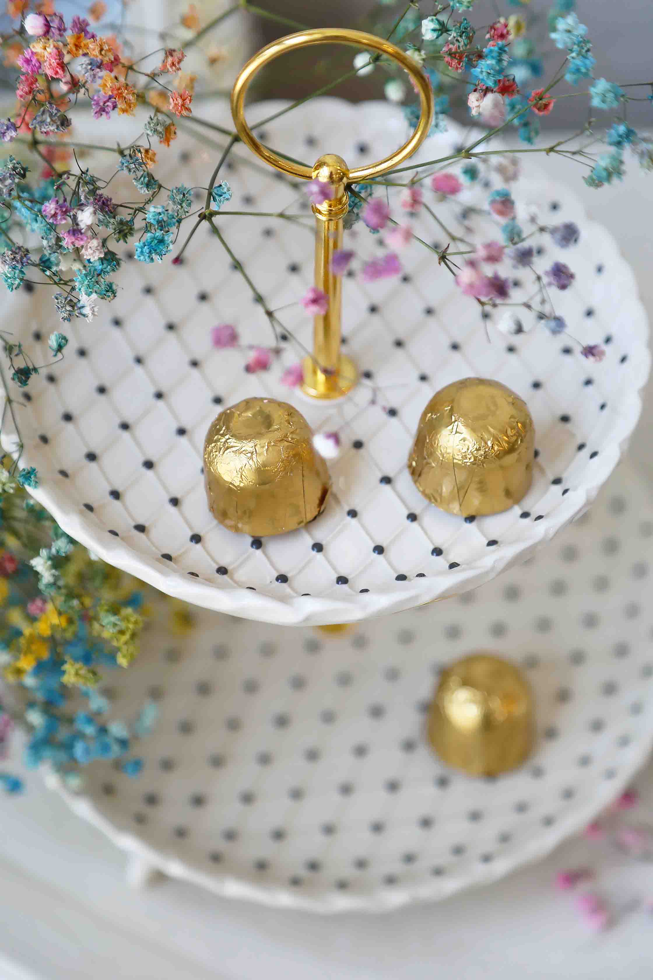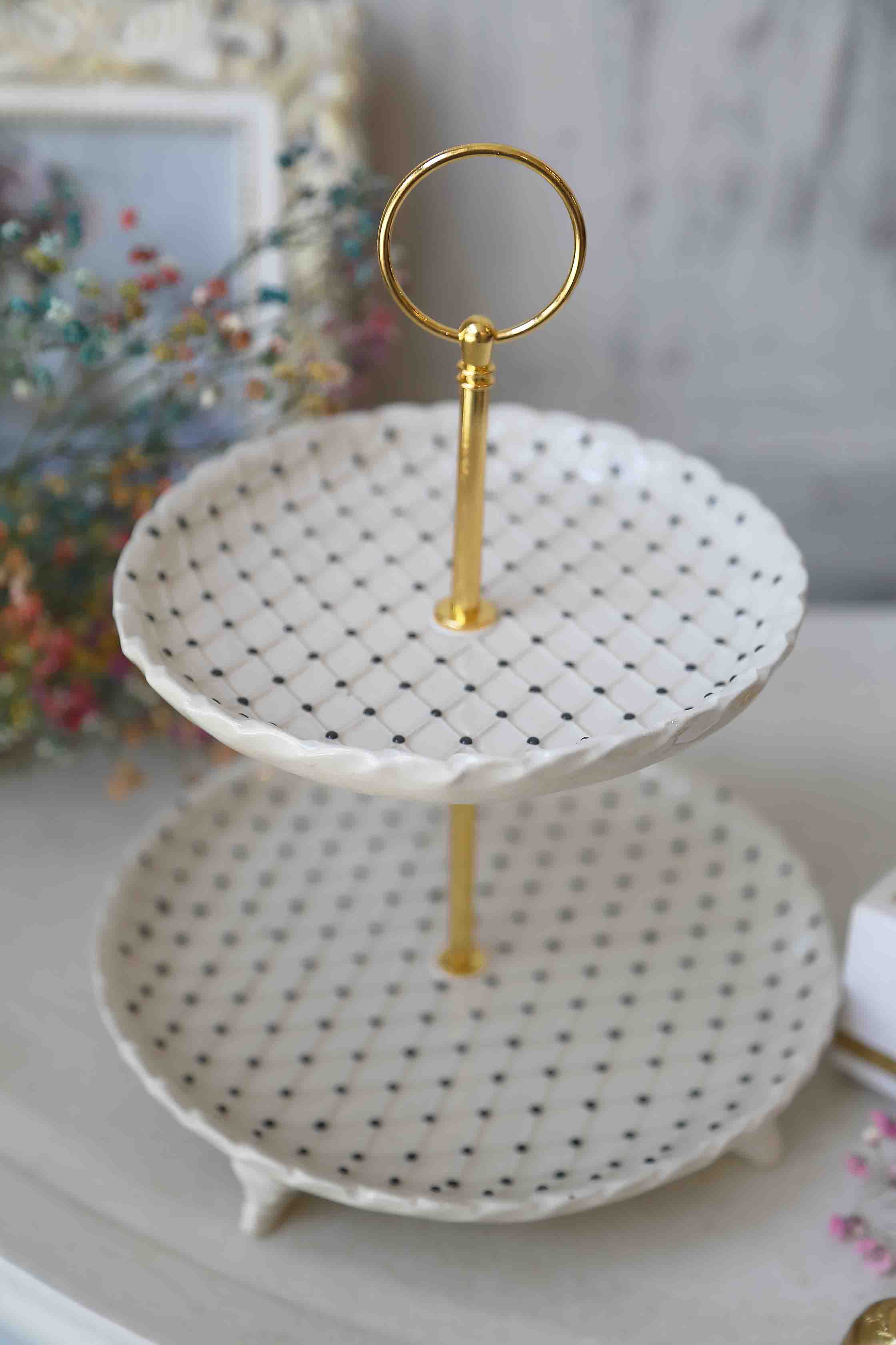 Dviejų aukštų desertinė, serviravimo lėkštė. Metalinė aukso spalvos rankenėlė. Rombelių dekoras su juodais porceliano taškeliais. Rankų darbo balto molio keramika. Desertams, šokoladams, vaisiams ar kitiems skanėstams.