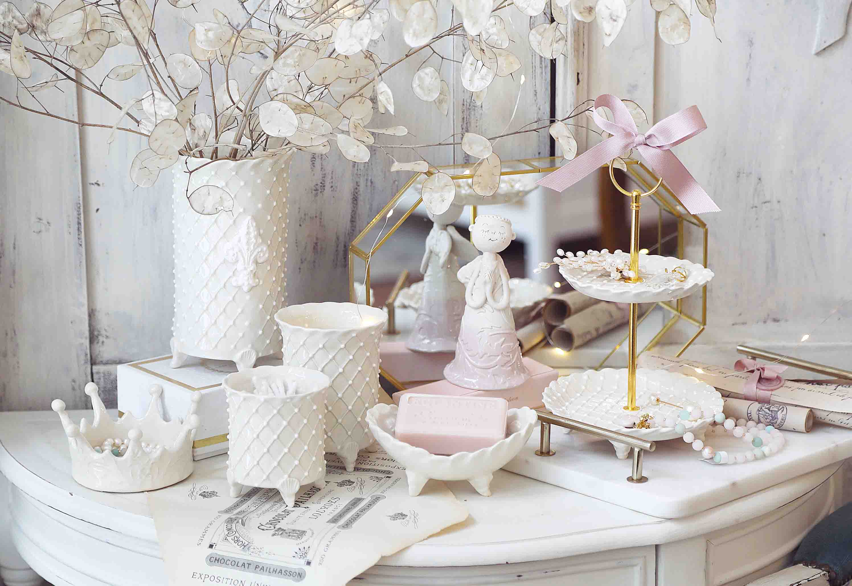 Dviejų aukštų nedidelė papuošalinė. Metalinė aukso spalvos rankenėlė. Rožinis ripsinis kaspinėlis. Rombelių baltais taškeliais dekoras. Rankų darbo balto molio keramika.