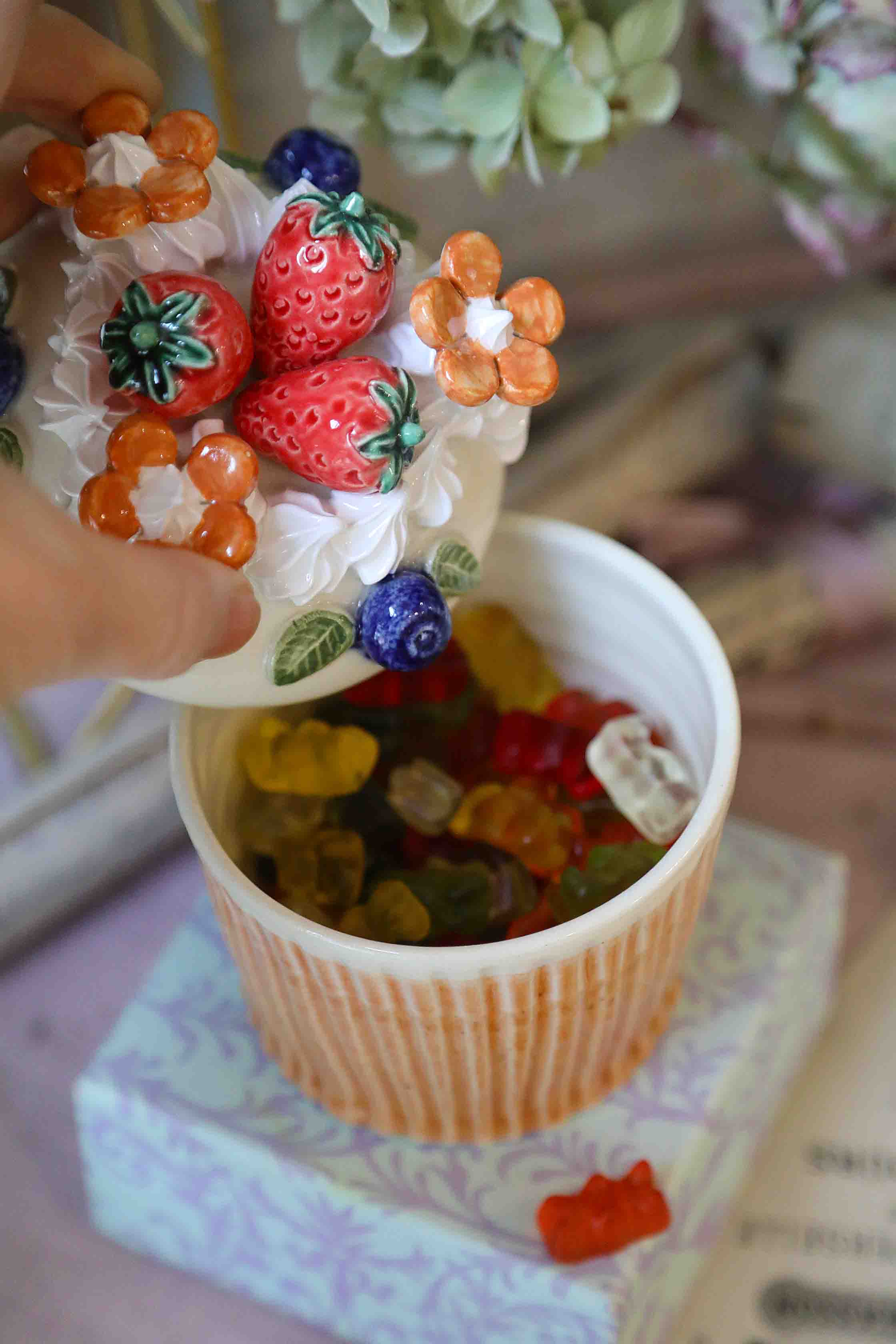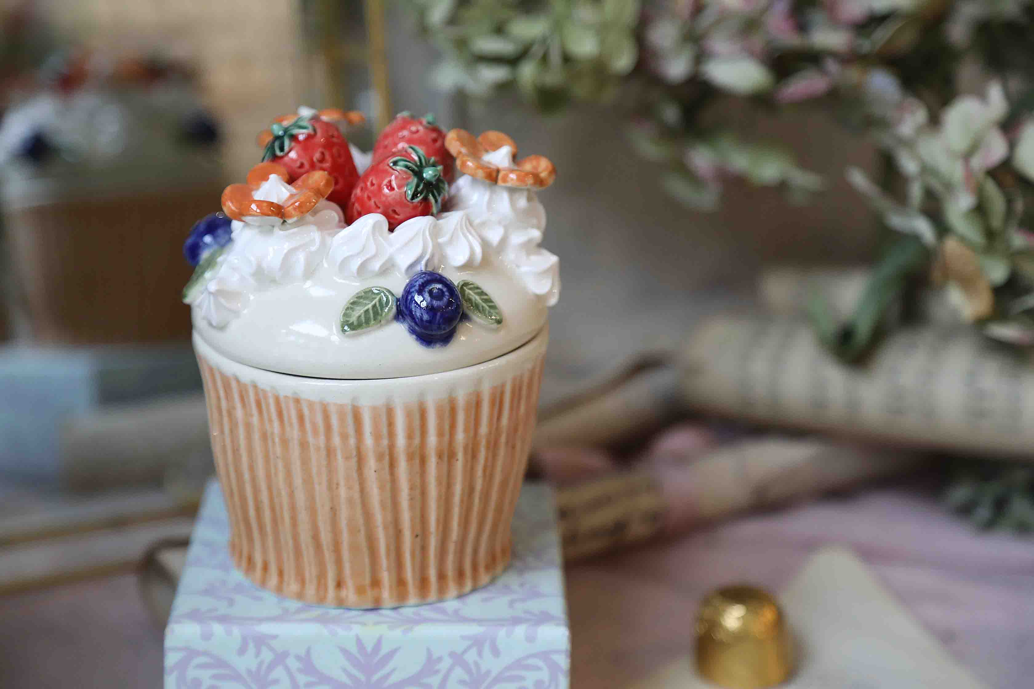 Indelis su dangteliu, stilizuotas kaip keksiukas su šilauogėmis, braškėmis bei porceliano morengais. Paskanintas su guminukų gėlytėmis. Gali būti naudojamas kaip cukrinė, kaip indelis biriems saldainiams paslėpti, ar papuošalams susidėti.