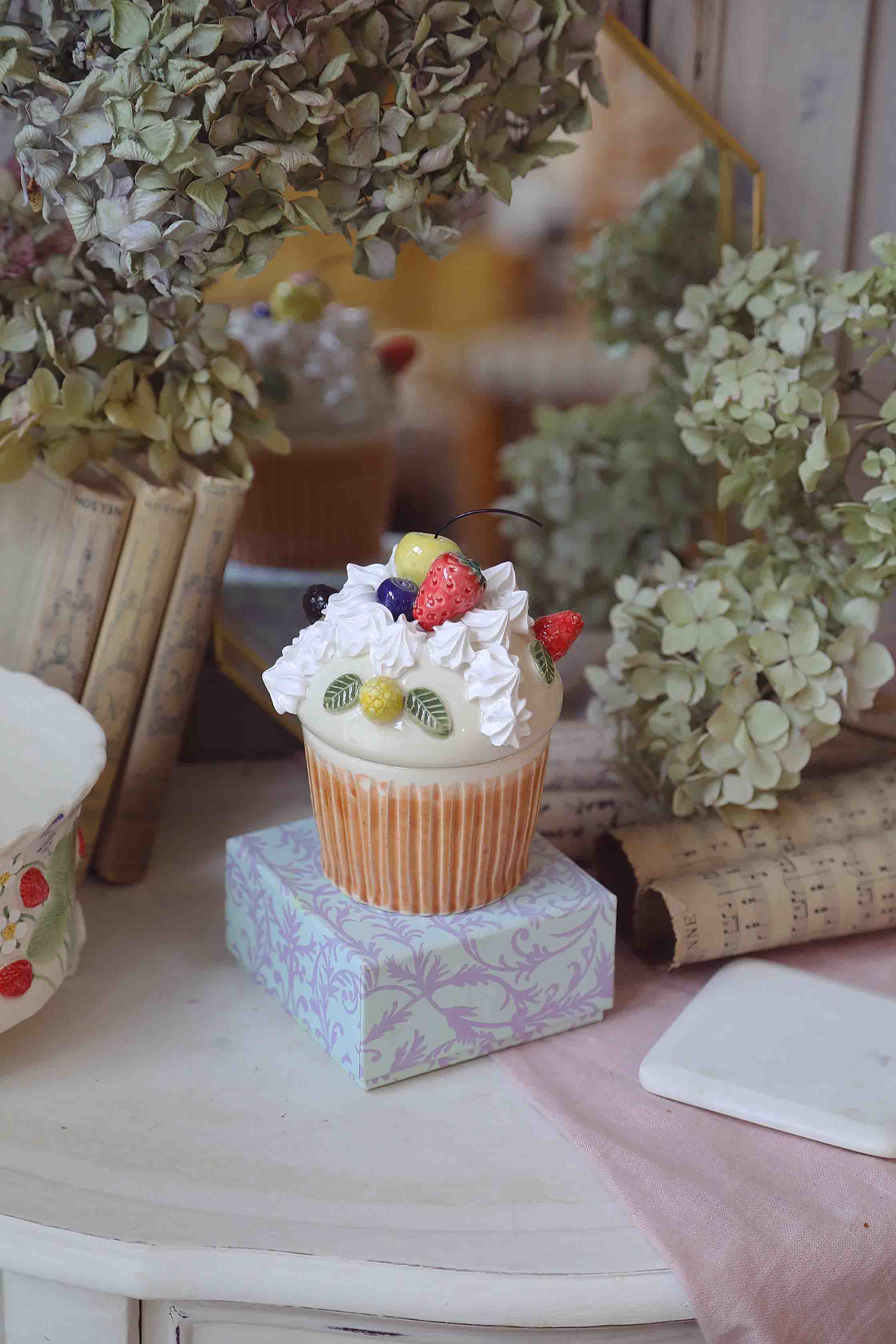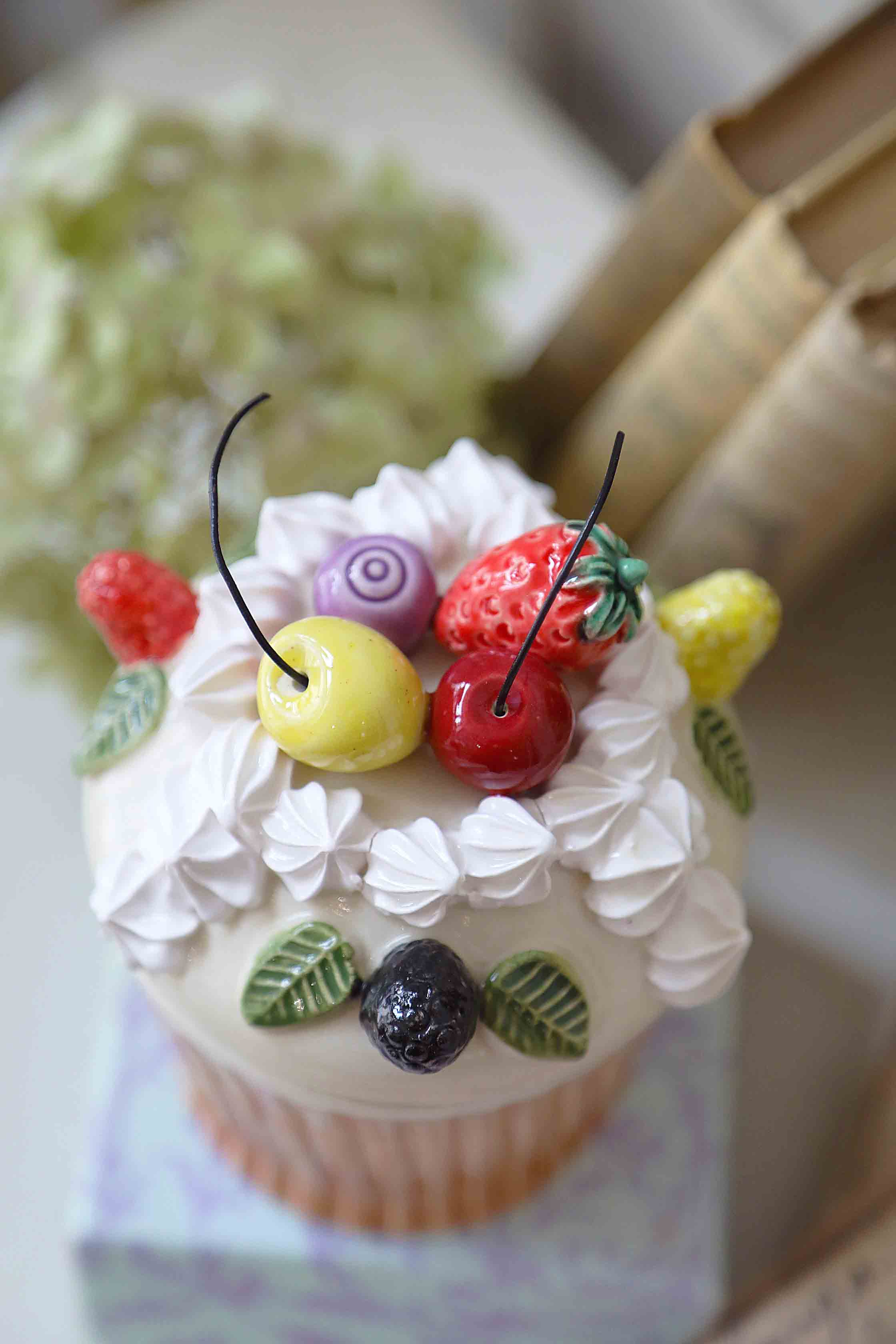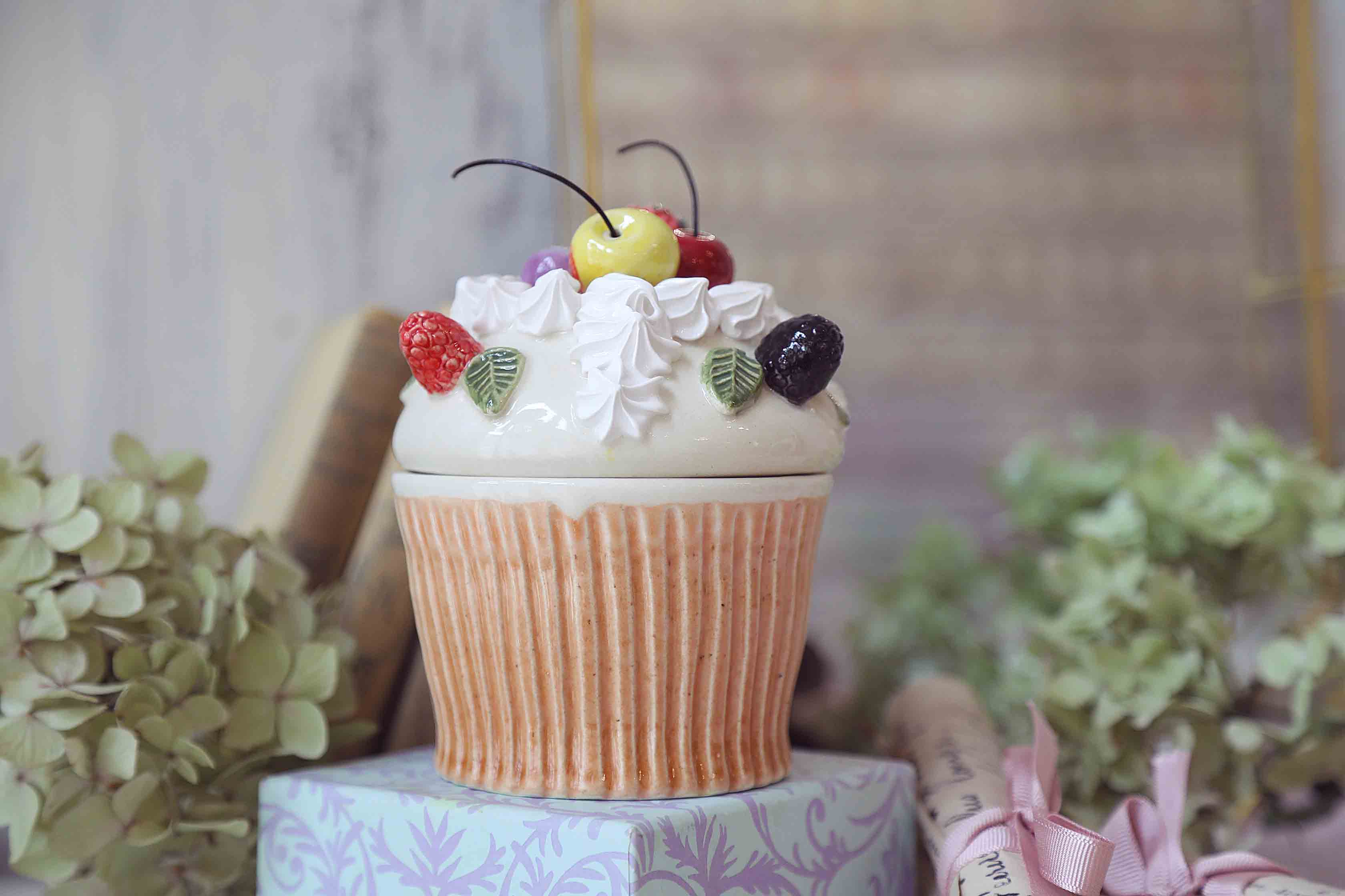 Indelis su dangteliu, stilizuotas kaip keksiukas su avietėmis, trešne bei porceliano morengais. Gali būti naudojamas kaip cukrinė, kaip indelis biriems saldainiams paslėpti, ar papuošalams susidėti.