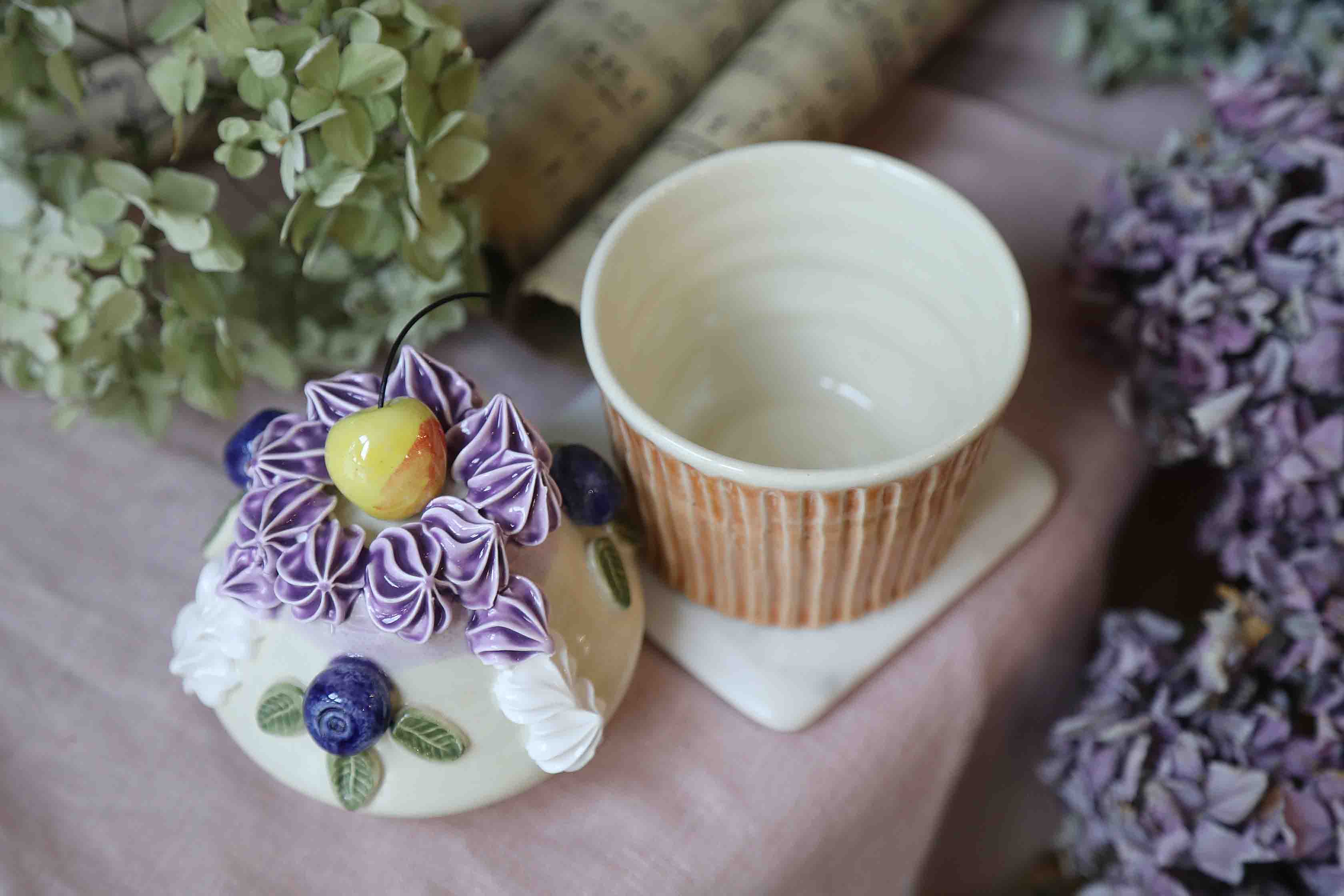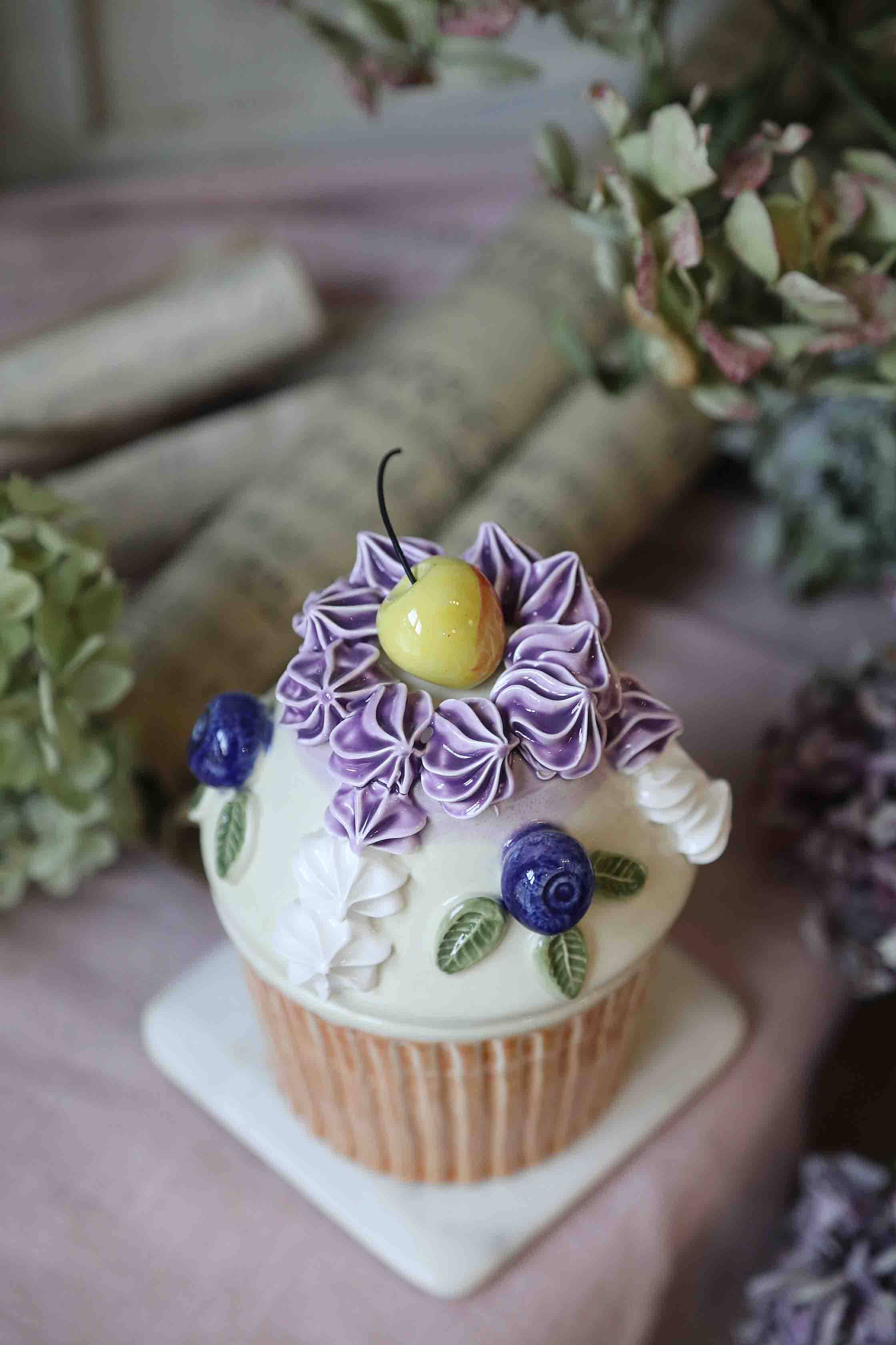 Indelis su dangteliu, stilizuotas kaip keksiukas su šilauogėmis, trešne bei porceliano morengais. Gali būti naudojamas kaip cukrinė, kaip indelis biriems saldainiams paslėpti, ar papuošalams susidėti.