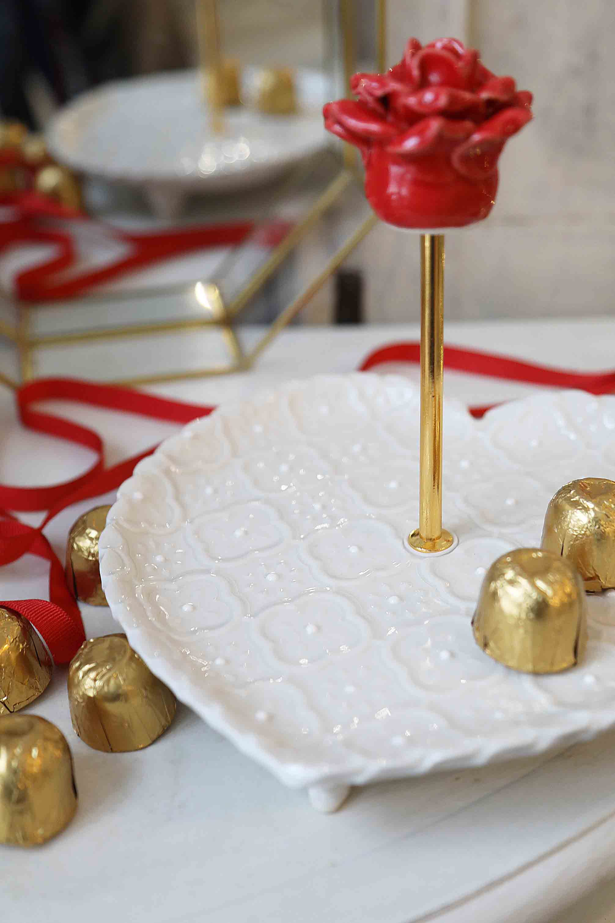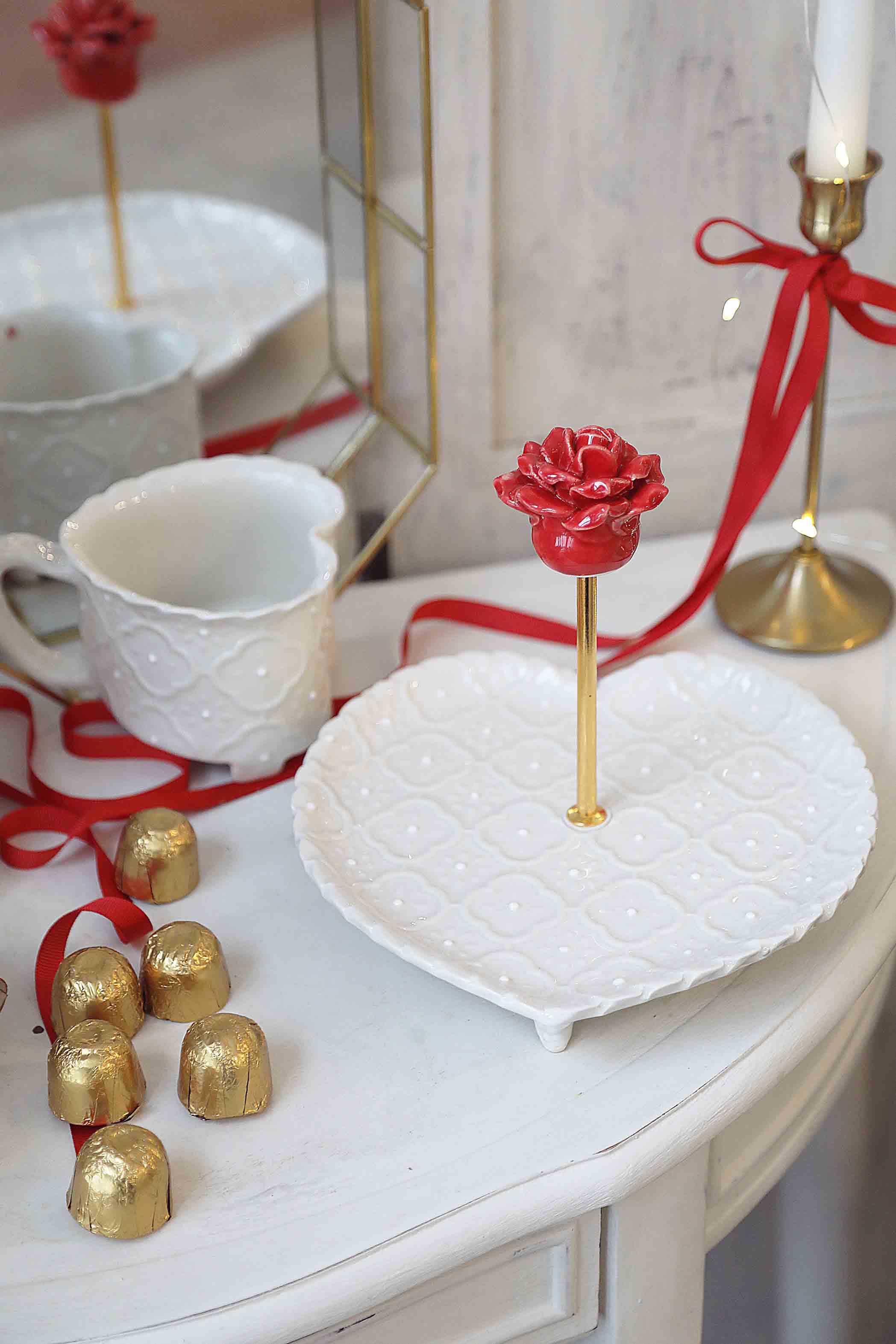 Serviravimo lėkštė su versalio dekoru. Širdies formos, ant kojelių, kreminės spalvos. Auksinės spalvos rankenėlė su rože. Stilingai paserviruokite užkandžius, desertus. Šventinio stalo puošmena. Taip pat gali būti naudojama, kaip padėkliukas vonioje, miegamajame papuošalams, smulkmenoms. Rankų darbo balto molio keramika.