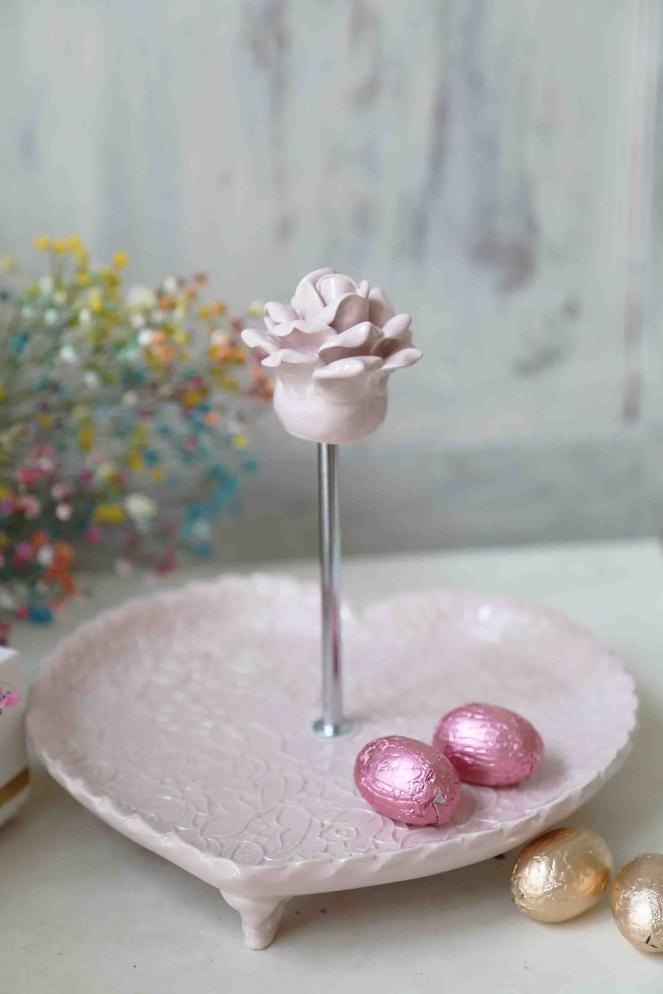 Serviravimo lėkštė su rožyno dekoru. Širdies formos, ant kojelių, rožinės spalvos. Sidabro spalvos rankenėlė su rože. Stilingai paserviruokite užkandžius, desertus. Šventinio stalo puošmena. Taip pat gali būti naudojama, kaip padėkliukas vonioje, miegamajame papuošalams, smulkmenoms. Rankų darbo balto molio keramika.