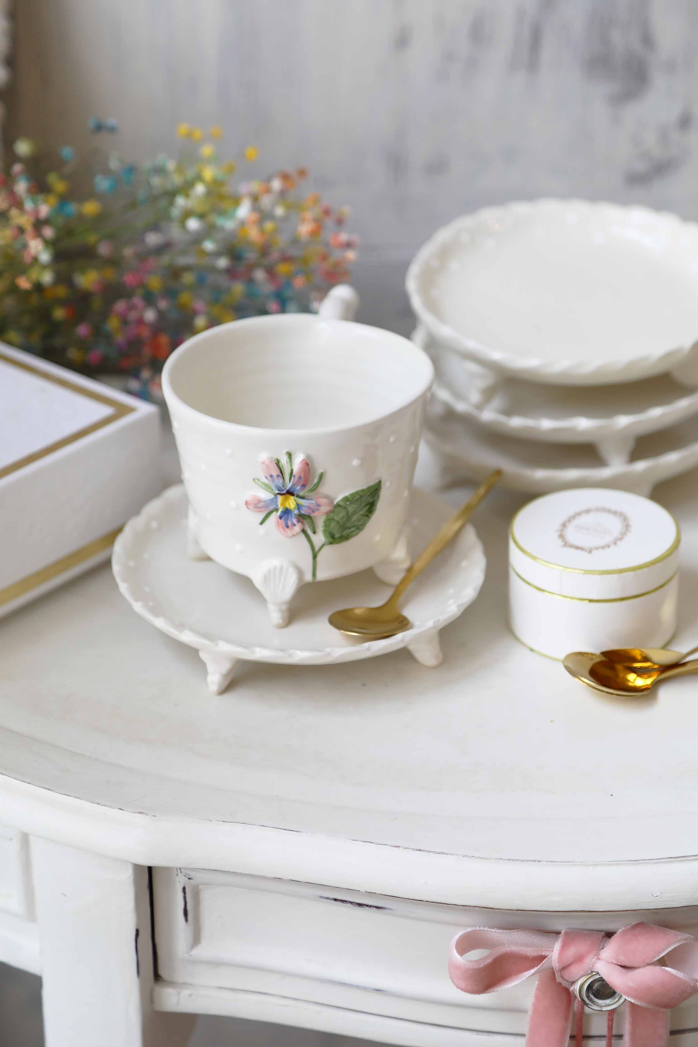 Apvalios formos lėkštutė baltais taškeliais, gali būti naudojama su jūsų norimu puodeliu.