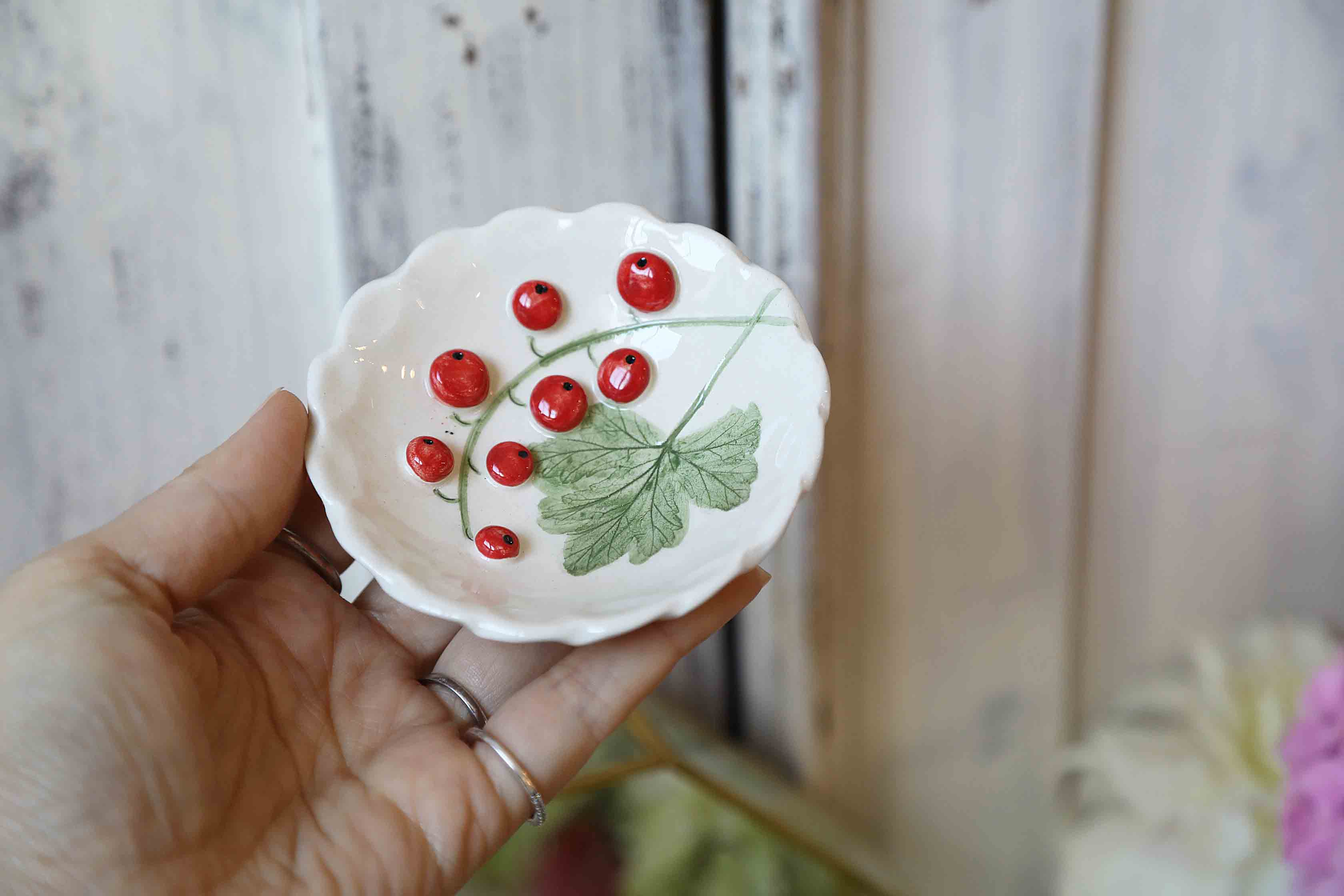 Indelis mini su serbentų šakelės dekoru, tinka šaukšteliui medaus, pasidėti arbatos pakeliui, druskai. Visi indeliai pagaminti rankomis, todėl dviejų vienodų nerasite.