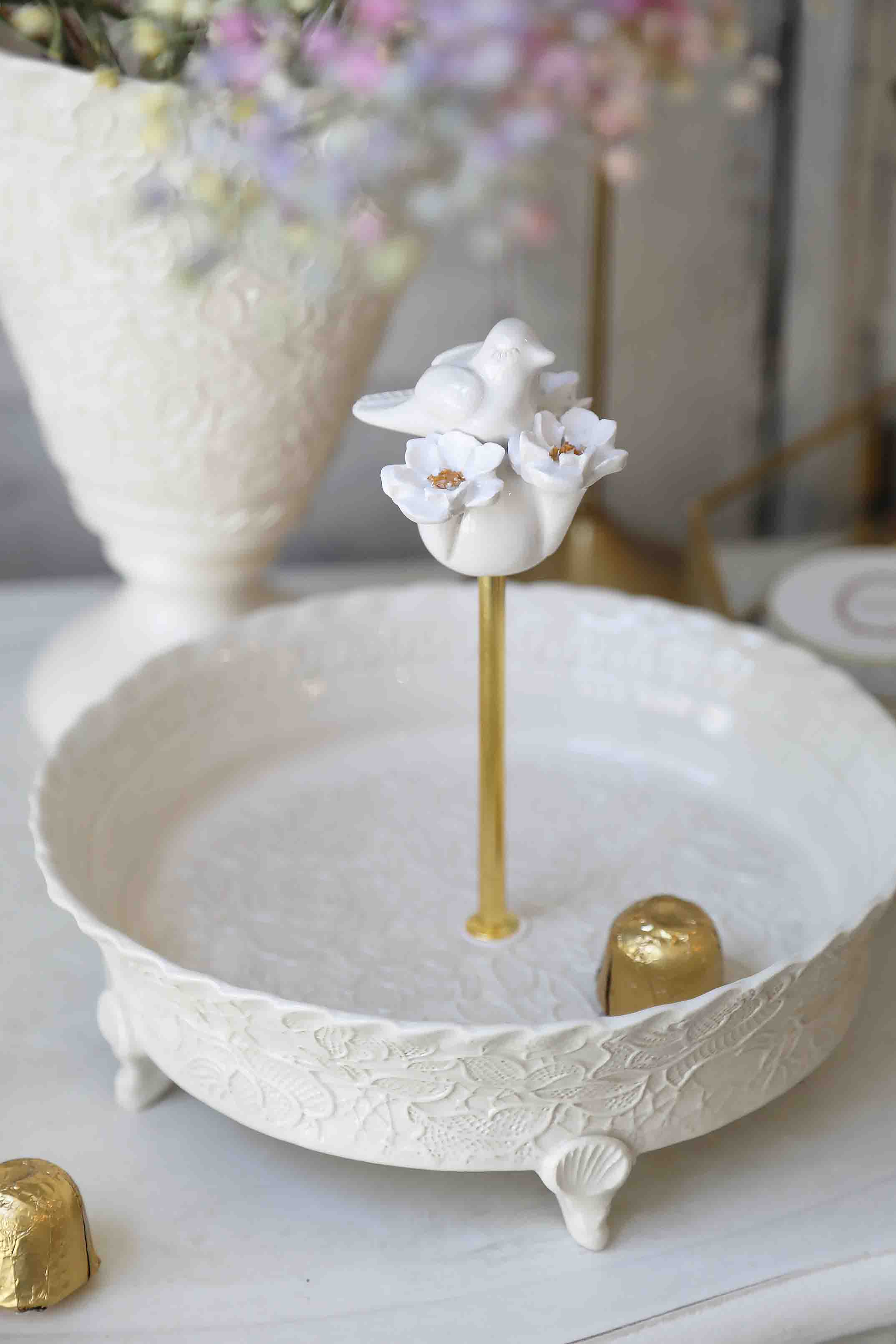 Serviravimo padėkliukas su rožyno dekoru. Apvalios formos, ant kojelių, kreminės spalvos. Auksinės spalvos rankenėlė su paukštelio dekoru. Stilingai paserviruokite užkandžius, desertus. Šventinio stalo puošmena. Taip pat gali būti naudojama, kaip padėkliukas vonioje, miegamajame papuošalams, smulkmenoms. Rankų darbo balto molio keramika.