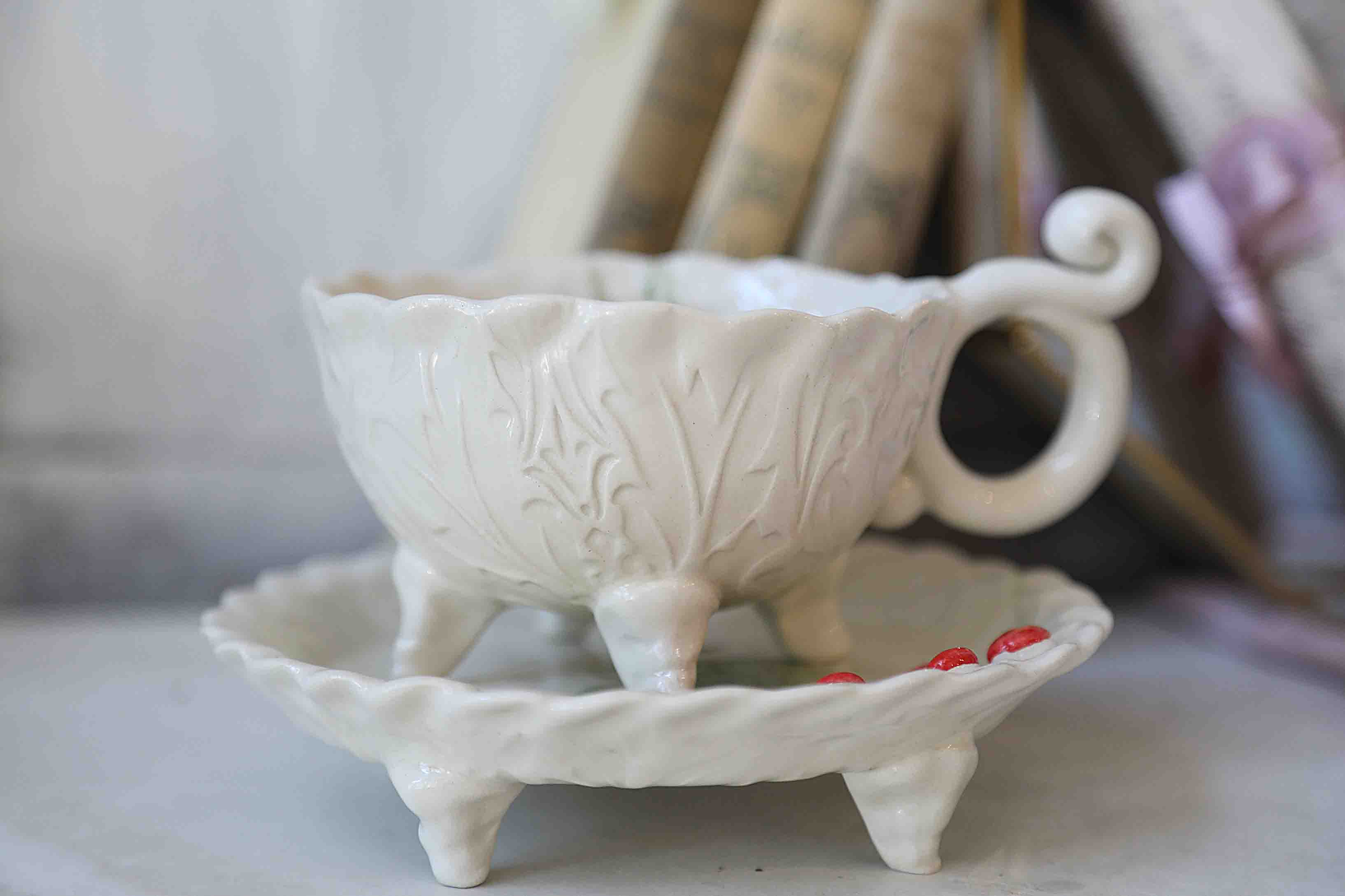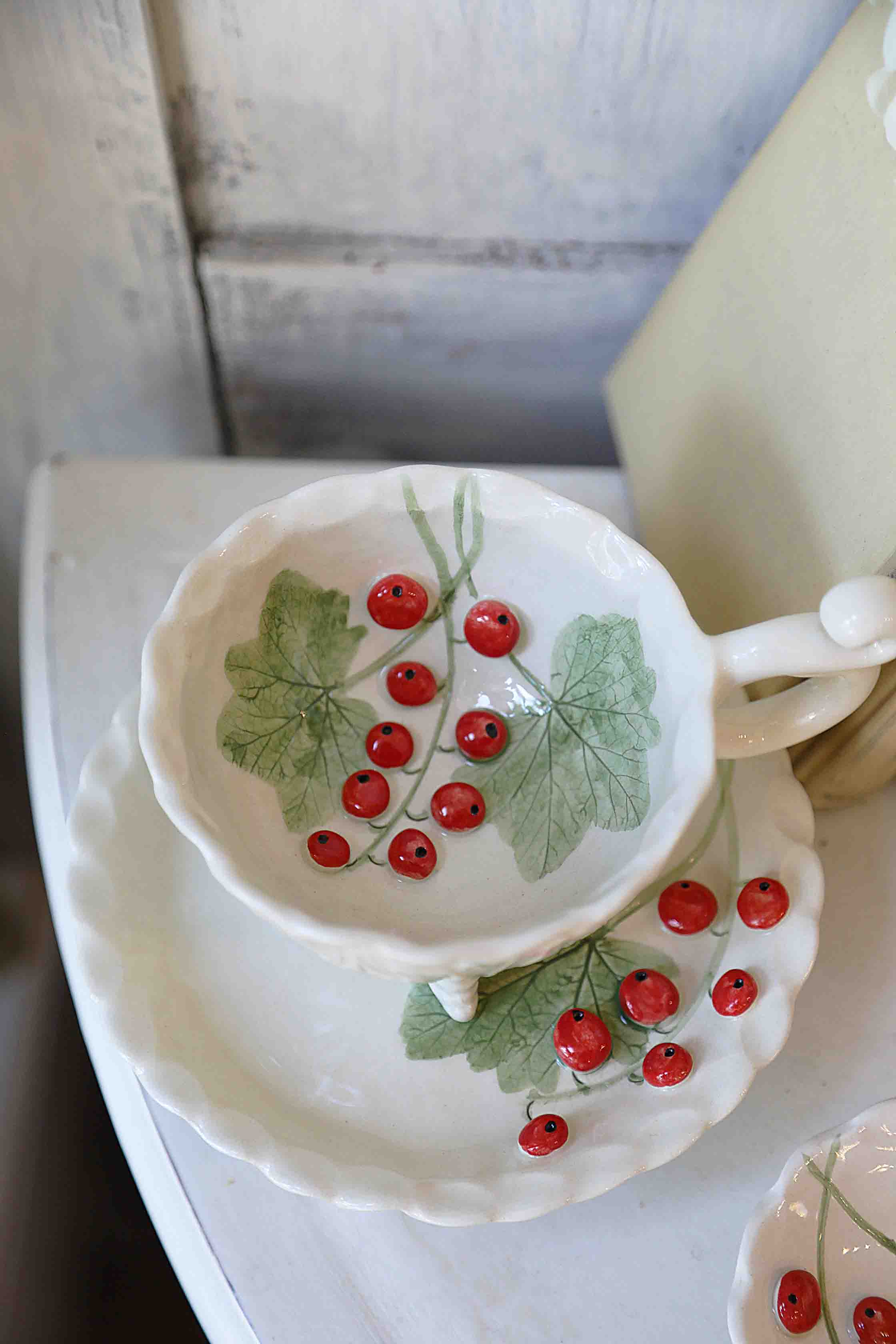Balto molio puodelis ir lėkštutė, su raudonų serbentų dekoru. Kiekvienas dekoras tapytas rankomis, todel puodeliai visi skirtingi.