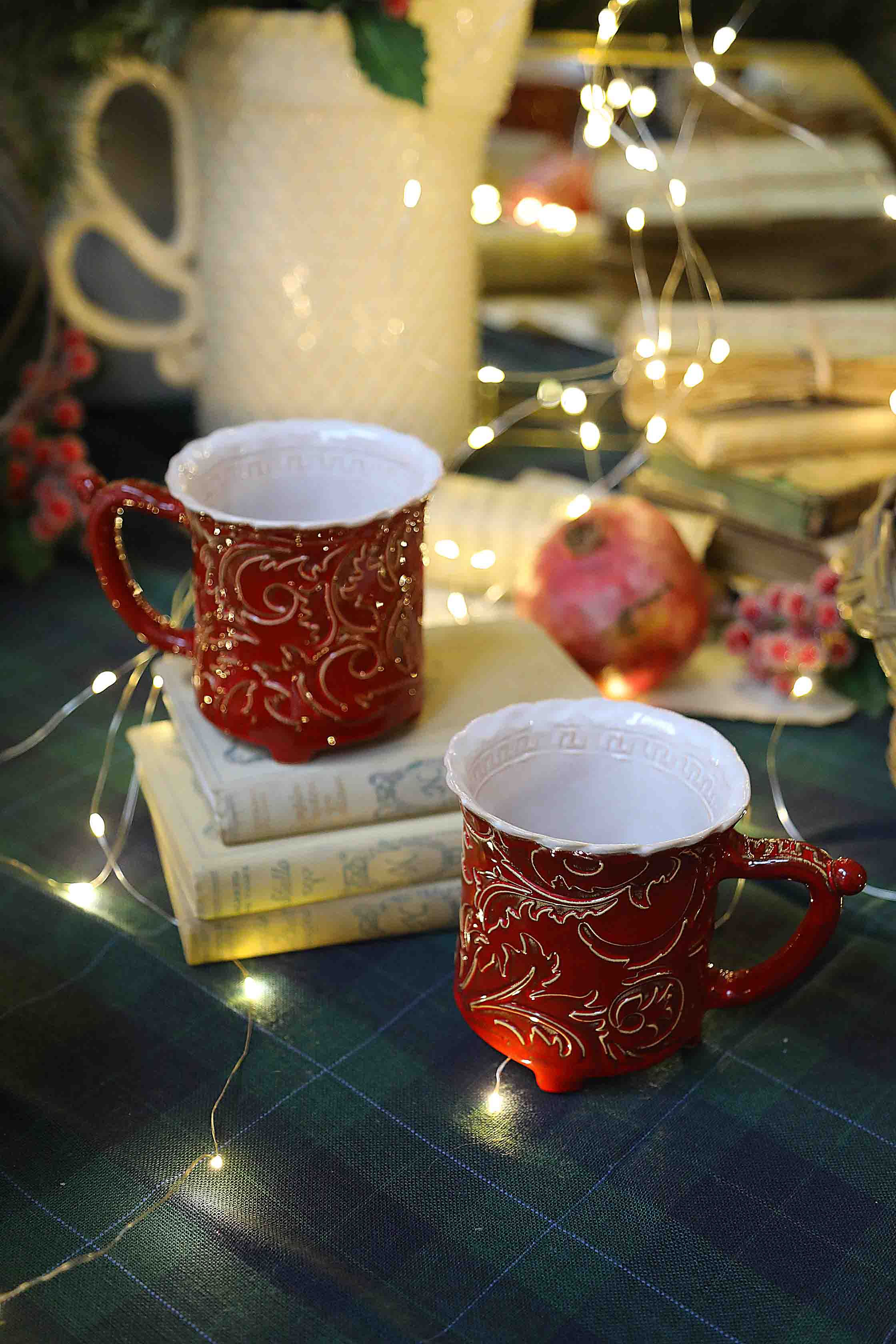 Keramikos puodelis, stambaus damasko ornamento rašto. Sodrių žiemiškų spalvų glazūra. Kiekvienas lipdytas individualiai, todėl puodeliai visi skirtingi. Didesnės talpos, patogus laikyti.