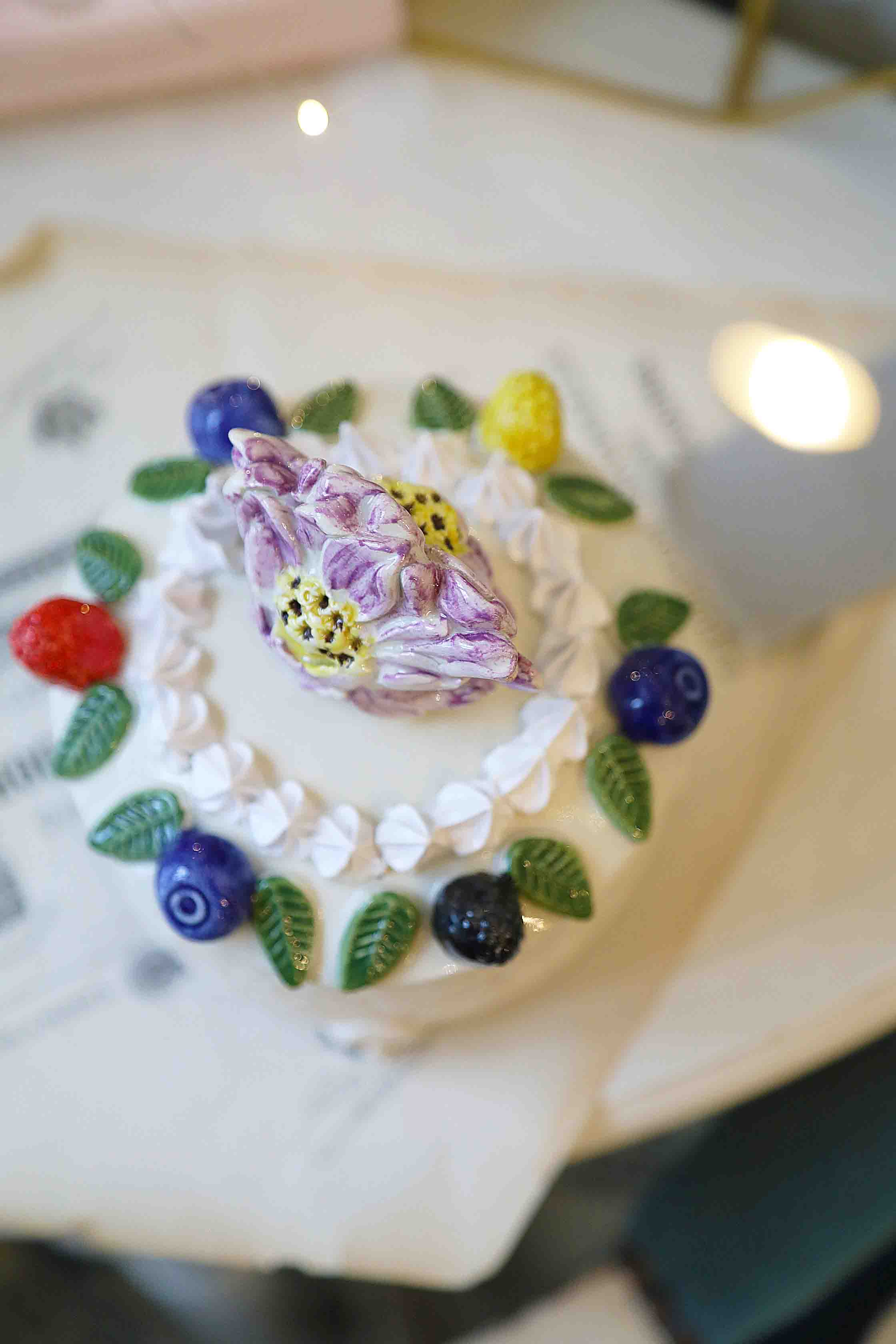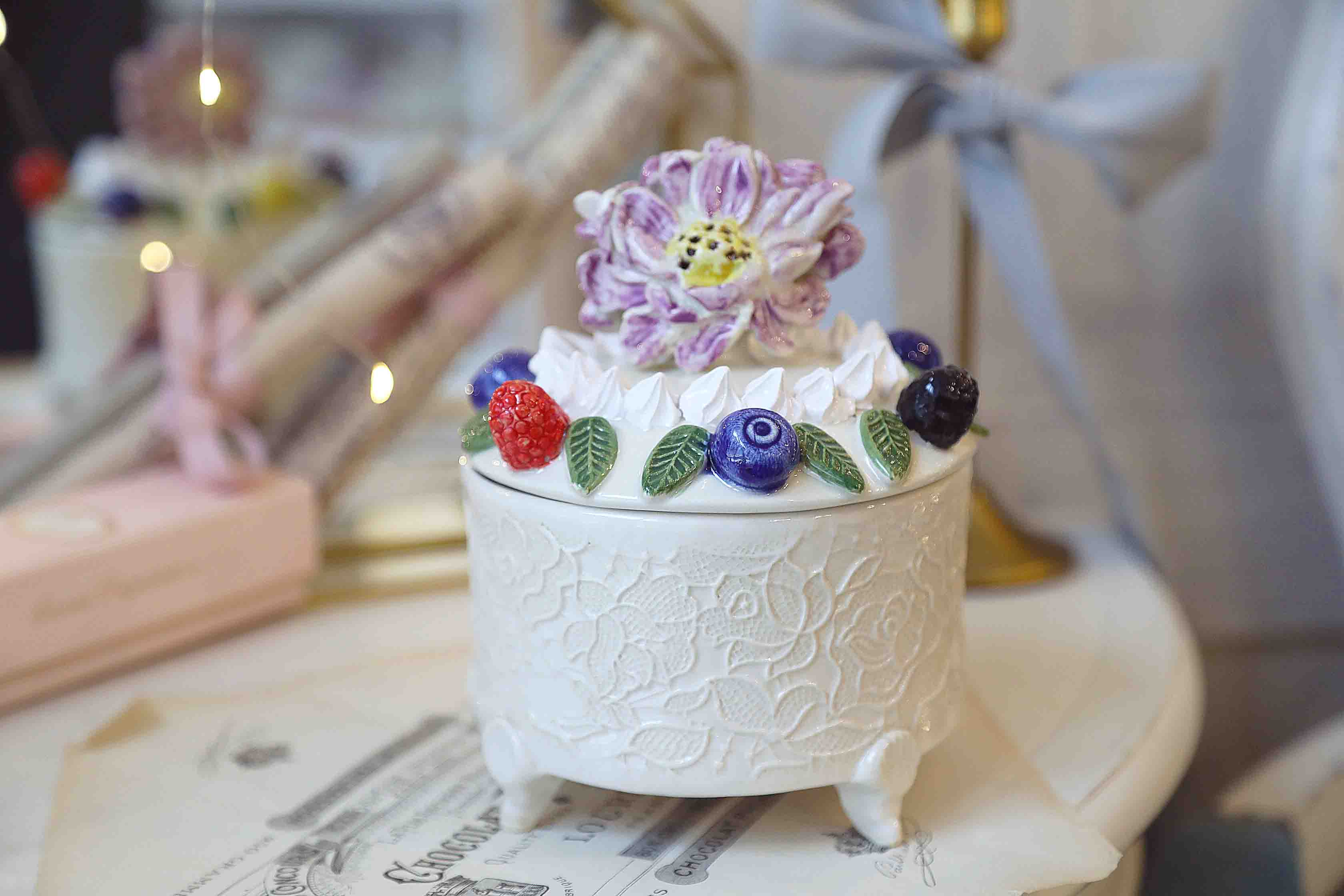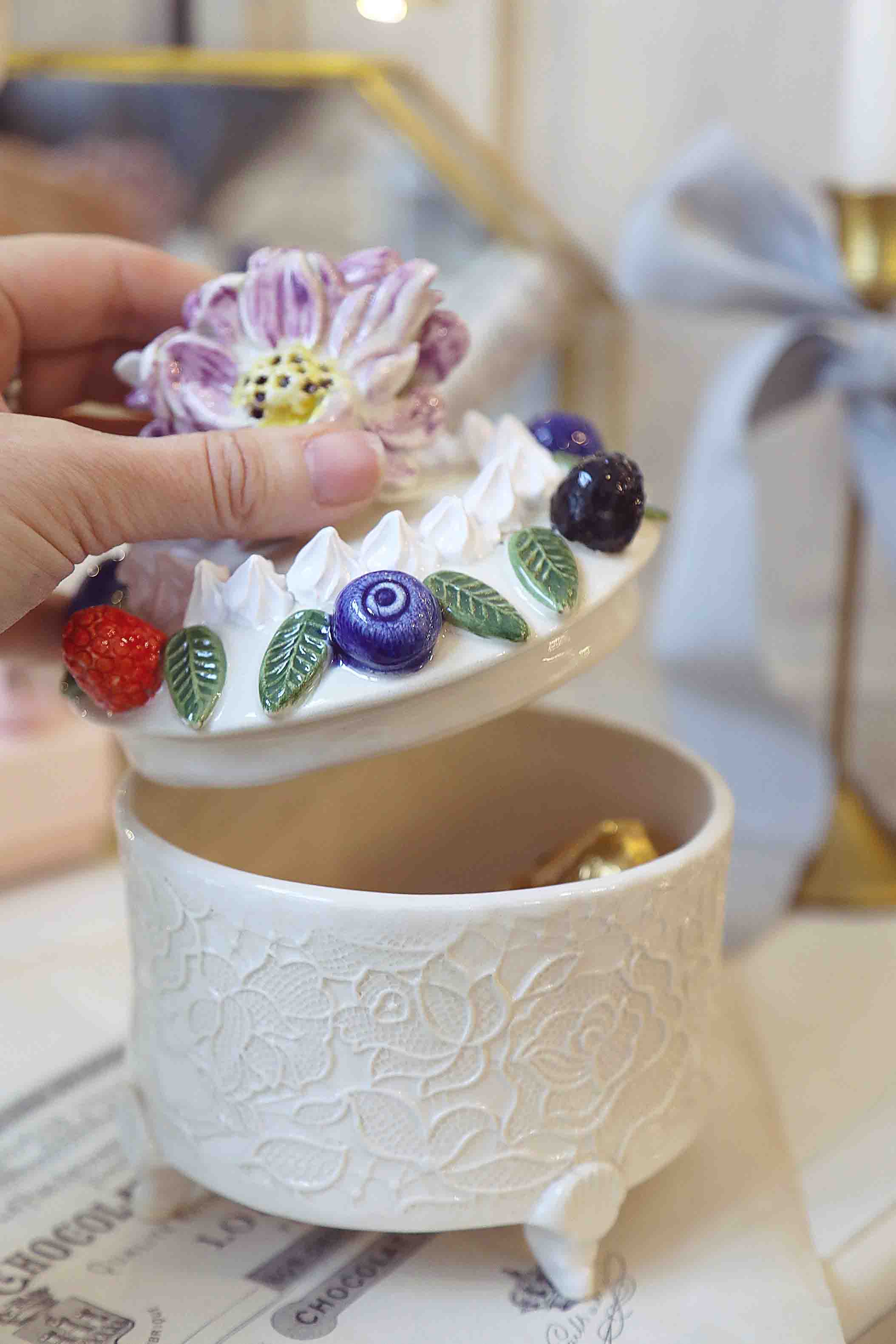 Išskirtinio dizaino rankų darbo indas su dangčiu, iš balto molio su tapytu gėlių dekoru. Dangtelio rankenėlė stilizuota kaip gėlės žiedas. Padabinta uogomis ir morengais.